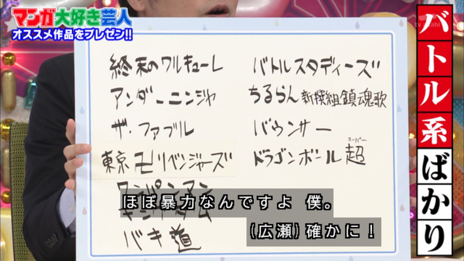 ケンコバ&バカリ&川島&山内らマンガ大好き芸人 今読んでるマンガは何?フリップ一覧 厳選!オススメの1冊を熱烈プレゼン 広瀬アリスの読んでるマンガも大公開アメトーーク!の「マンガ大好き芸人」 約四年ぶりに、漫画好きが集結! 前回から続投は、ケンドーコバヤシさん、麒麟の川島さん、広瀬アリスさん さらに今回は、かまいたちのお二人、バカリズムさん、ジャングルポケットの太田さんというガチ ちょいエロtv 広瀬アリスを セクハラアメトーークマンガ大好き芸人 6月30日深夜に放送されたアメトーークが、面白かったのでこのページで自分のコメントを入れつつ再現したいと思います。